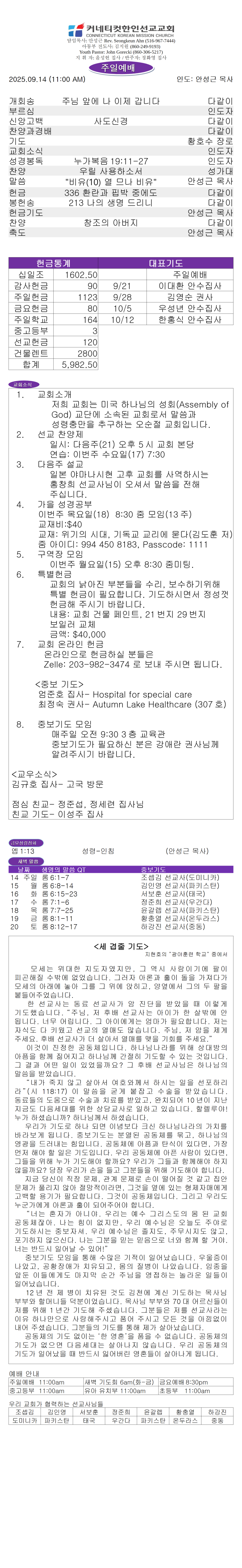 September 13, 2025 . CKMC 2025.09.14 교회주보